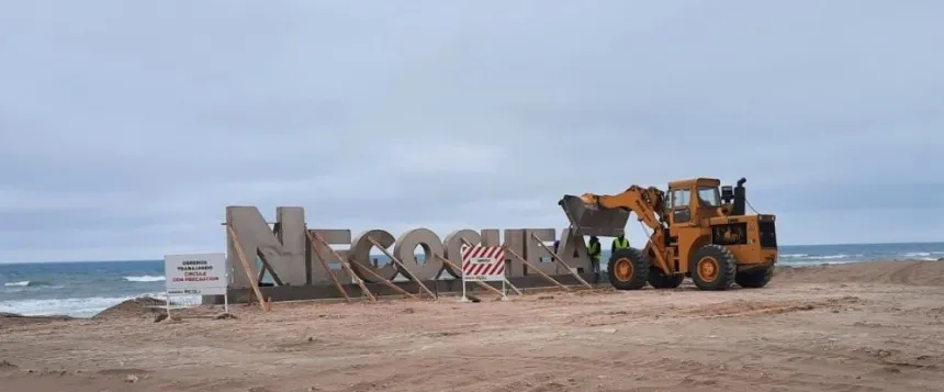 Sobre las veredas de la costanera, en la Avenida 2, las cuadrillas de las empresas adjudicatarias de la licitación pública avanzan en la culminación de los trabajos de hormigonado y colocación de baldosas protráctiles. Otro grupo de trabajadores, ayudados por una pala mecánica, instalan las letras de hormigón que terminarán por conformar el nombre de la ciudad y una nueva postal para vecinos y turistas.