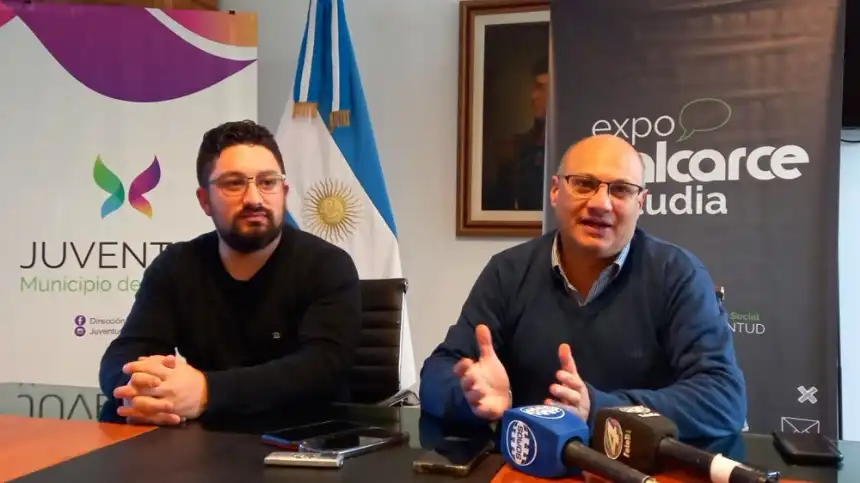 El intendente de Balcarce, Esteban Reino, acompañado por el director de Juventud, Juan Ignacio Ibarlucía, presentó la séptima edición de la expo que muestra las ofertas de educación universitaria y terciaria de la zona.